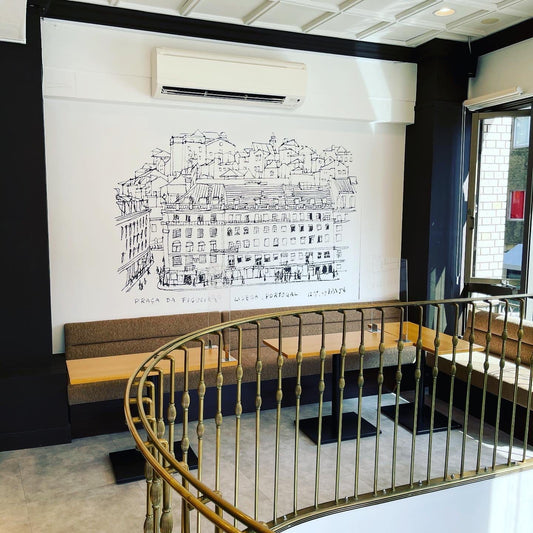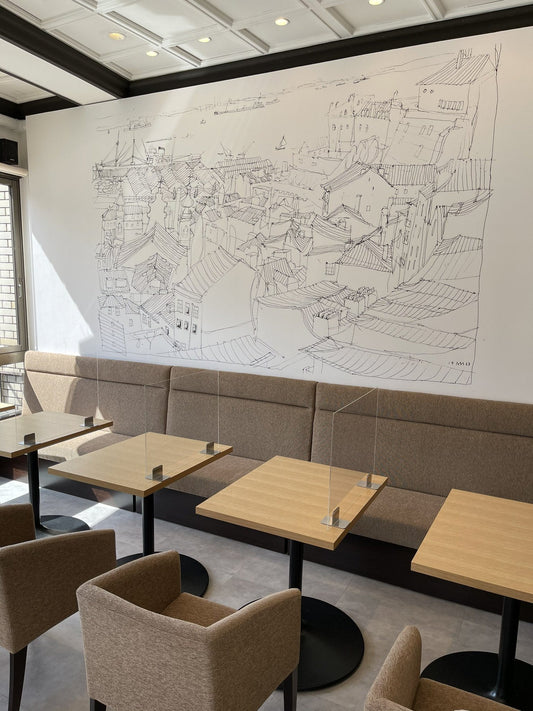 店内に足を踏み入れると、芸術家、無汸庵 綿貫宏介氏のデザインを取り入れた空間が広がります。印象的な壁のデザインを眺めていると、浮かび上がるのは神戸の風景。